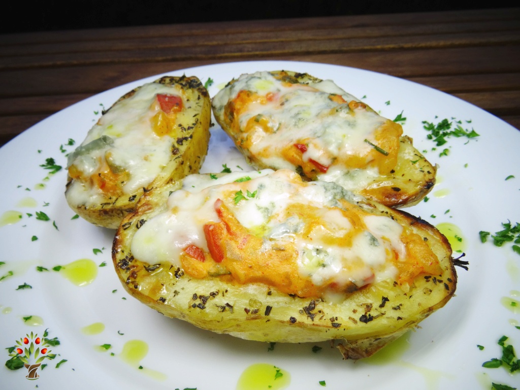 Omyté středně velké brambory rozkrojíme podélně vejpůl, osolíme, opepříme, okořeníme dále bylinkami a grilujeme při teplotě 150°C na přímé grilování po dobu 20 - 25 minut. Po vychladnutí vydlabeme část vnitřku grilovaných brambor. "Střídku" z brambor použijeme do smetanové směsi s na kostičky krájenými Jalapeno papričkami, jarní cibulkou, čerstvou petrželkou, kayenským pepřem, bílým jogurtem, smetanou, solí a pepřem. Prohřátou směs plníme do vydlabaných grilovaných brambor. Poklademe kusky nivy a dáme finálně zápect do grilu.