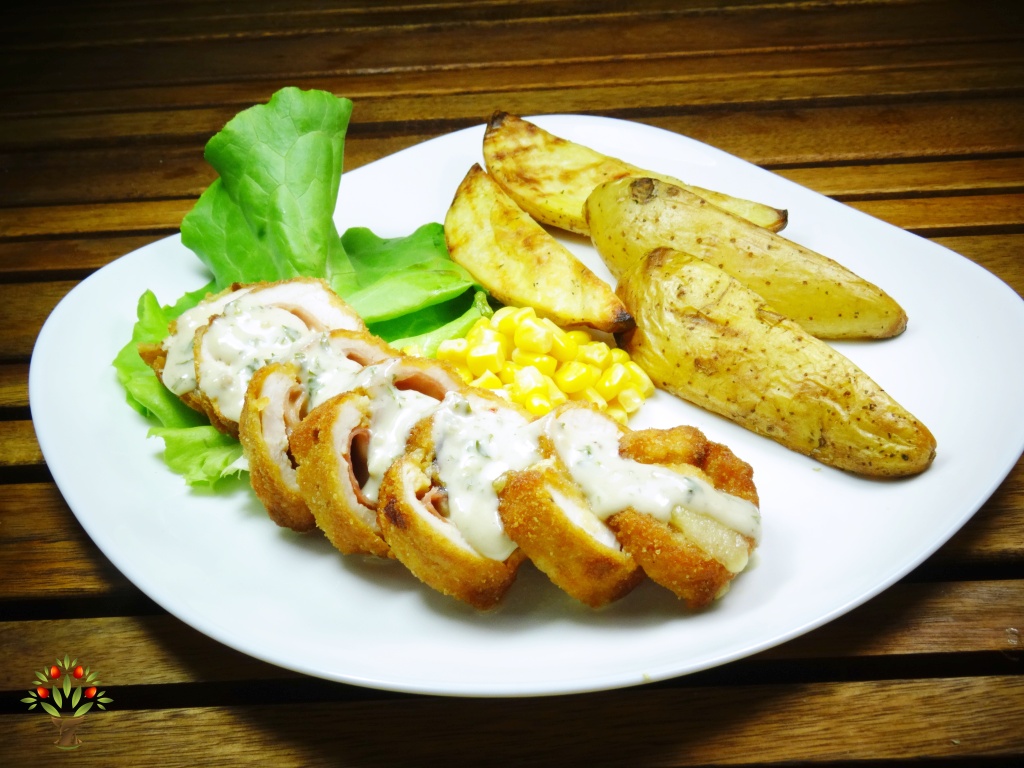 Hotové Cordon Bleu nakrájíme na šiřší plátky nebo rozřízneme v polovině. Zalijeme smetanovou omáčkou a podáváme s grilovaným bramborem, popř. se sezónní zeleninovou oblohou.