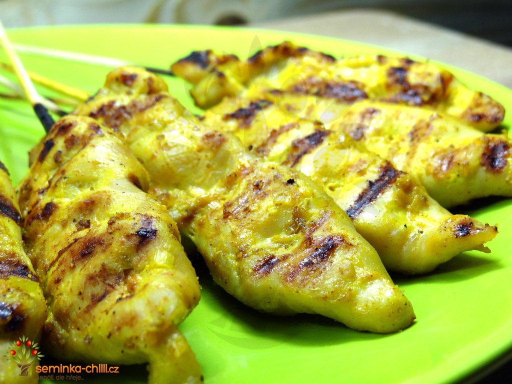 Z prsního kuřecího masa odkrojíme "kuřecí svíčkovou", malé převislé kousky kuřecích prsíček (nejjemnější část kuřecího masa). Omyjeme a napíchneme na bambusové tyčky předem namočené ve vodě (nebo na dřevěné špejle). Na marinádu pokrájíme na malé kousky citronelu, česnek, citrónovou šťávu, mletou kurkumu, rybí omáčku, kokosové mléko (či smetanu), chilli omáčku nebo chilli mleté koření a drcený koriandr, třinový cukr, černý pepř vložíme do hmoždíře a utřeme v krémovitou pastu (marinádu). Marinádou poté zaléváme připravené kuřecí svíčkovou napíchanou na špejlích a necháme tři hodiny marinovat. Každou hodinu obracíme, aby se chutě dostali co nejvíce do kuřecího masa.