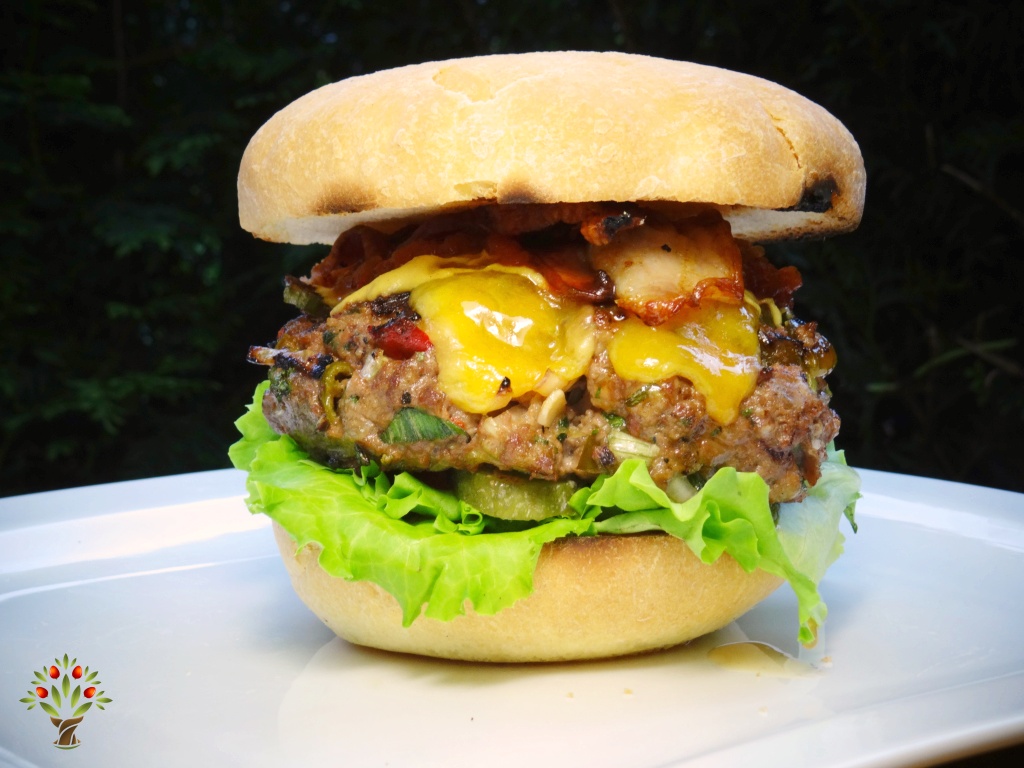 Završení celého díla: rozpůlené hamburger bulky z prudka ogrilujeme cca 1 minutu a klademe ve vrstvách: zeleninový salát, rajče, kys. okurka, maso, hořčice, salsa a nakonec plátky grilované slaniny, přiklopíme a můžeme si roztrhnout ústa :)