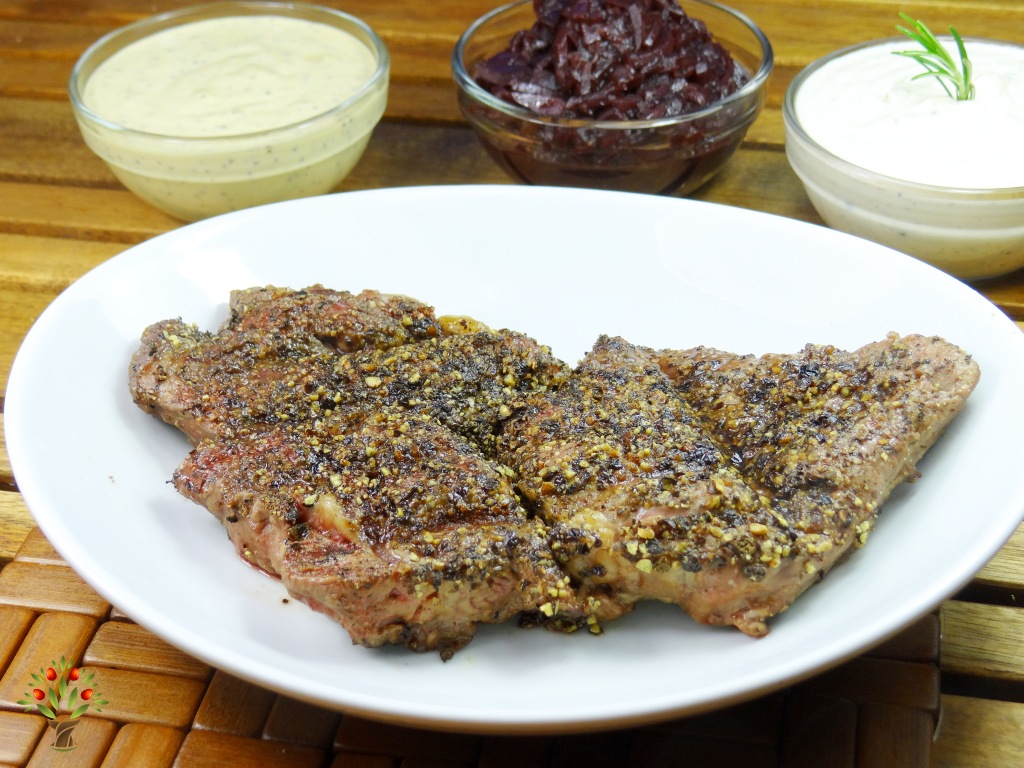 Ke grilovanému Rib-eye steaku na černém pepři na grilu Weber vyniknou omáčky a DIPy jako např. pepřová smetanová omáčka, cibulový DIP aj.