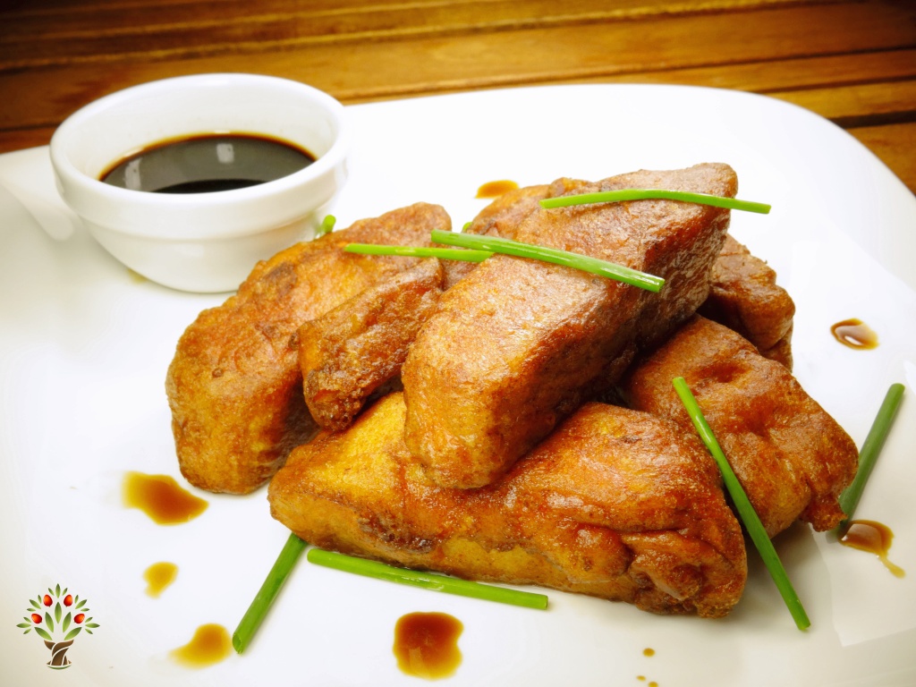Smažení rybí tyčinky z tilápie klademe na rozpálený talíř společně s mističkou sójové omáčky, kde kousky rybích tyčinek máčíme.