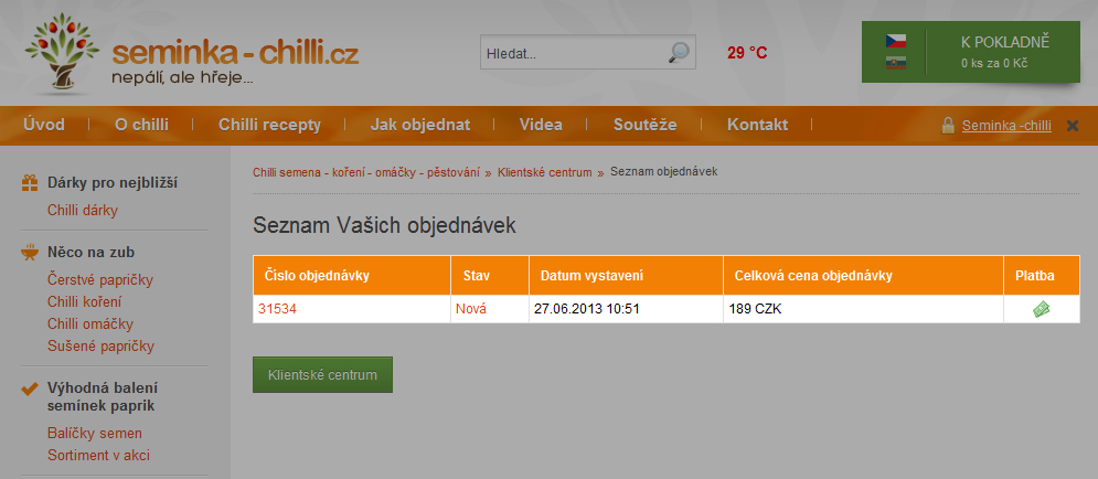 Nyní se nacházíte na samotném výpisu objednávek, kde vidíte jednak číslo objednávky, její aktuální stav, datum, cenu objednaných produktů a co je nejdůležitější, ikonu pro platbu pomocí platební brány GoPay. Tuto ikonu můžete použít i za několik dní po uskutečnění objednávky, protože je stále aktivní.