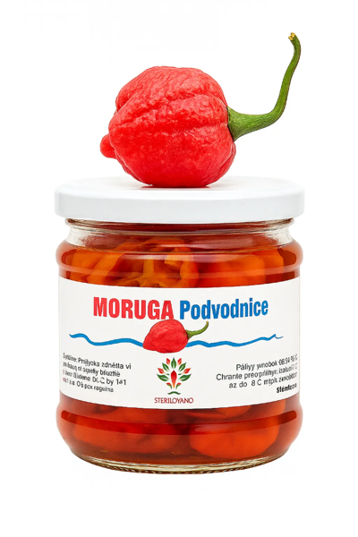 Čerstvé papričky Trinidad Scorpion Moruga. Bez chemických konzervantů, aromat. Hmotnost pevného podílu 40 g. Objem 210ml.