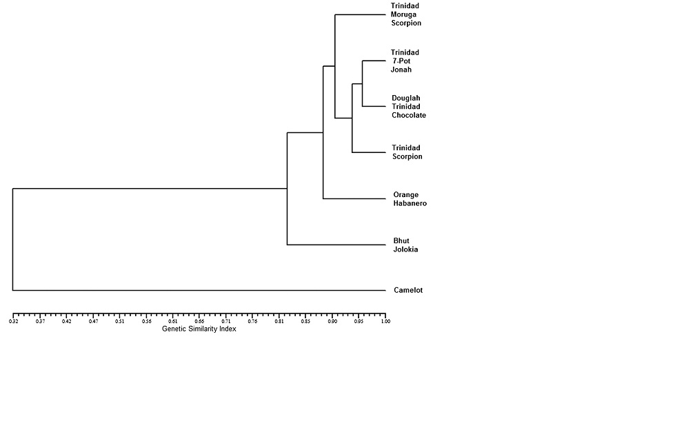 Genetická podobnost mezi odrůdami byla vypočítána zprůměrováním vzdáleností mezi shluky (clustery), které jsou graficky prezentovány ve formě dendogramu (nahoře). Větší čísla u Indexu Genetické Příbuznosti (Genetic Similarity Index - GSI) znamenají bližší taxonomickou přibuznost mezi shluky. Jsou tu dva primární shluky, které oddělují druhy Capsicum (to jest C. annuum a C. chinense). Zástupce C. annuum v této analýze, odrůda Camelot, vytvořila vlastní shluk, který se seskupil se zástupci C. chinense, a to s hodnoutou GSI 0,32. Bhut Jolokia se spojila s ostatními zástupci C. chinense s GSI 0,82. Orange Habanero vytvořil skupinku s Trinidad Moruga Scorpion, Trinidad 7-Pot Jonah, Douglah Trinidad Chocolate a s Trinidad Moruga Scorpion s GSI 0,89. Rovněž Trinidad Moruga Scorpion se spojil s Trinidad 7-Pot Jonah, Douglah Trinidad Chocolate a Trinidad Scorpion s GSI 0,91. Trinidad Scorpion se seskupil s Trinidad 7-Pot Jonah a Douglah Trinidad Chocolate s GSI 0,94. A nakonec Trinidad 7-Pot Jonah vytvořil skupinku s Douglah Trinidad Chocolate s nejvyšší hodnotou GSI 0,96.