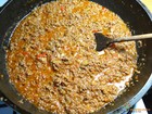 Na olivovém oleji orestujeme na hrubo pokrájenou cibuli, česnek, rajčata, chilli papričky, poté přidáme rajčatový protlak a přilijeme trochu vína. Chvíli podusíme a dochutíme solí, pepřem, bazalkou a chilli kořením. Necháme stát. V druhém hrnci na rozpáleném oleji orestujeme mleté maso, na které poté vylijeme směs.