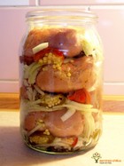 Oloupeme špekáčky, nařízneme a vysypeme chilli kořením, nebo omáčkou a vložíme plátek oloupané cibule. Takto připravený špekáček vkládáme po vrstvách společně s kořením, cibulí a chilli papričkami. Po naplnění až po hrdlo zalijeme vařícím lákem a zavíčkujeme. Necháme vychladnout a vložíme do lednice, kde necháme týden ustát.