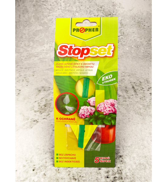 Stopset žluté lepové šipky, lákají škodlivý hmyz (molice, smutnice, vrtule, létavá imaga mšic). Jsou určené na ochranu rostlin v zahradách, sadech, sklenících, ale i na ochranu pokojových rostlin. Lepové desky vyvěste v místě výskytu škůdce na úrovni výšky rostliny. Šipky zapíchněte skosenou částí do půdy. U pokojových rostlin se doporučuje dát do každého květináče jednu desku šipku, ve sklenících a na záhonech vyvěste lepové desky po 2 meterech. Lepové desky vyměňte za nové, jakmile se lepová plocha pokryje hmyzem nebo dojde k zaprášení povrchu. Obvykle vydrží asi 6 týdnů po vyvěšení.